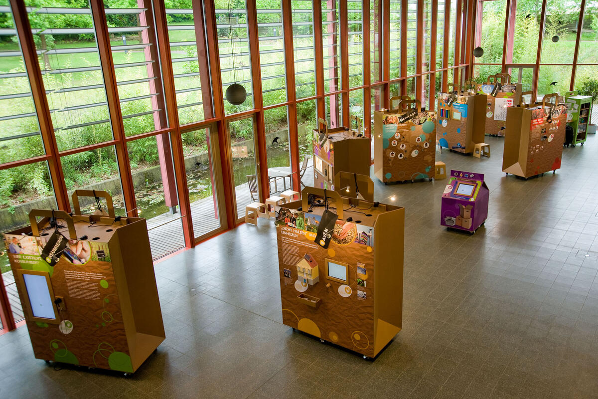 In der Ausstellung „KonsumKompass“ werden auf überdimensional großen Einkaufstüten Beispiele eines nachhaltigen Konsums und zukunftsfähiger Lebensstile präsentiert. An 16 spannenden Mitmachstationen können Besuchende sich die Inhalte der Ausstellung mit Hilfe von interaktiven Modulen wie Monitoren, Hörstationen, Diaguckis, Modellhaus, Produktscanner, Kläppchentafeln, Tauschregal und mehr spielerisch erschließen. In den acht Themenbereichen stehen Produkte des alltäglichen Gebrauchs wie zum Beispiel Jeans, Handy, Computer, Fernseher, Wandfarbe, Papier, Möbel, Blumen und Fußball im Fokus. „Nutzen statt Besitzen“, „Tauschen statt Kaufen“ sowie „Mieten und Leihen“, sind einige Alternativen, die Besuchenden in der Ausstellung begegnen. Ebenso erfahren Sie, mit Hilfe welcher Label umwelt- und sozialverträgliche Alternativen erkennbar sind, wenn Sie etwas Neues benötigen.